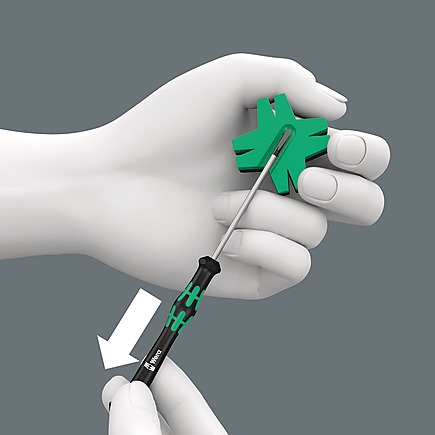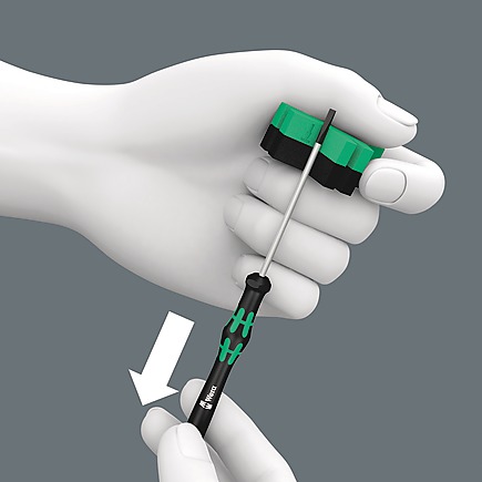 + Đơn giản chỉ cần cho dụng cụ chạy xuống mặt cực dương của dụng cụ tạo từ tính Wera/dụng cụ khử từ tính Wera – ngay lập tức dụng cụ nhiễm từ và dụng cụ có thể giữ ốc vít an toàn trên lưỡi. Để khử từ, chỉ cần cho dụng cụ chạy xuống một trong bốn mặt cực âm.